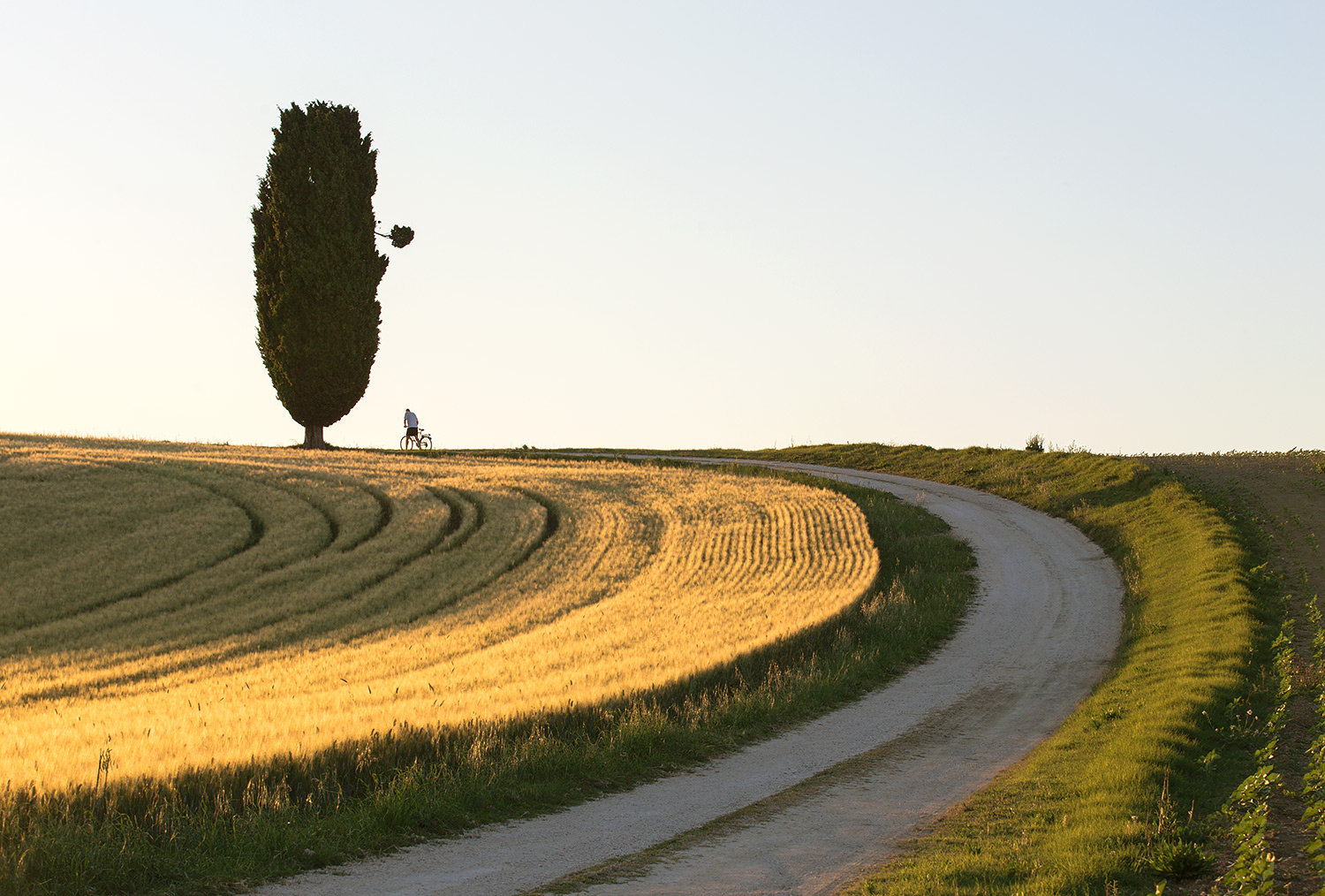 | Alla classica ripresa di una curva netta, poi sottolineata più volte nell'andamento dai solchi lasciati dal lavoro contadino sui campi, si aggiunge la simpatica sospensione di quel ramo che spunta birichino dalla chioma fitta, e sembra minacciare la saluta dell'omino con la bici a mano. Se può essere indicativo io avevo apprezzato la foto e la situazione complessiva e ho letto il titolo solo dopo aver scorso i commenti che mi precedevano. In una foto come questa tutto varia , a seconda di come l'occhio di chi osserva si pone. Personalmente trovo carina la caduta rami....eheh;  ma la cosa che più mi piace, e me la fa ricordare, è la salita in sé del ciclista, la sua quieta progressione, la leggera fatica che lo ha indotto nella sua progressione solitaria  a procedere fuori sella. Mi colpisce anche il sole pieno che rende il cielo latteo e il campo dorato. Una lieve malinconia nella solarità del giorno.