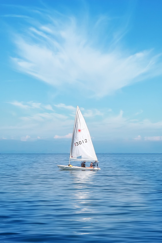Immagine molto delicata, con colori molto piacevoli, le nuvole soprastanti a forma di triangolo sembra concentrino l'attenzione sulla barca. C'è tanto mare, forse una rifilatina in basso gioverebbe alla composizione.