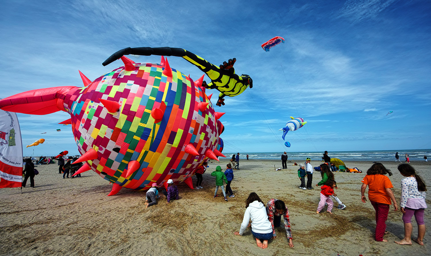 Una bella ripresa grandangolare che esalta la grandezza relativa del pesce palla... eheh rispetto ai ragazzini che lo circondano.
