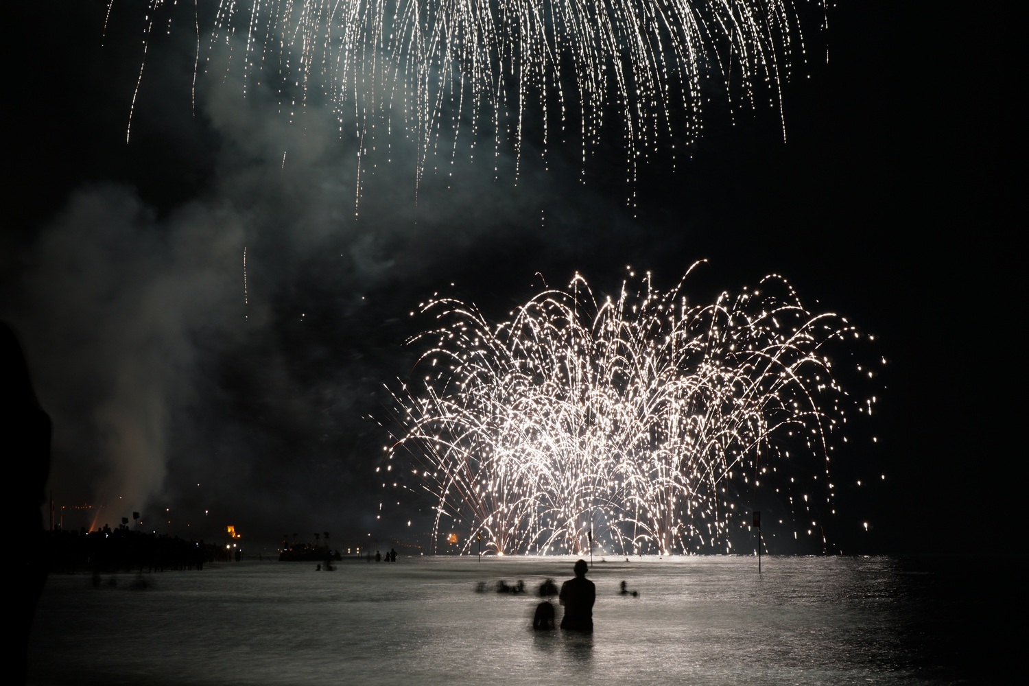 Ritagliano leggermente da entrambe i lati otterresti una compo più pulita, maggiormente concentrata sulla ricaduta dei fuochi e sui bagnanti, quasi minuscoli fantasmi a pelo d'acqua, sorpresi come noi dalla bellezza della esplosione di luci.