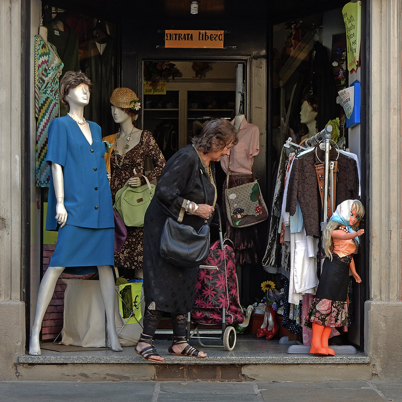 Molto bella questa foto,con tanti elementi da osservare.La signora un po' eccentrica sembra guardare compiaciuta la bambola,quasi un ritorno alla sua infanzia.Un caleidoscopio di colori e sogni da 1 euro,un paese dei balocchi con ingresso libero.Complimenti!  _________________ Sergio Demitri https://www.flickr.com/photos/124946035@N02/ |