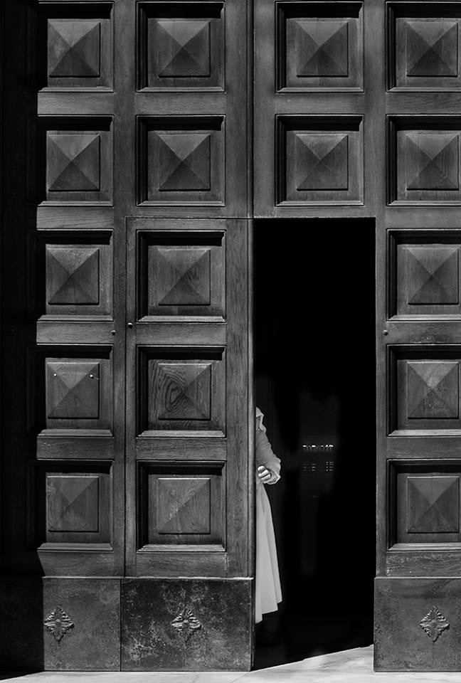 Mi piace molto questa ripresa. con la suorina che si affaccia appena sulla soglia, appena visibile dalle vesti bianche, quasi pudicamente una mera idea. Ottima la presenza accennata delle candele accese nella oscurità di sfondo. Però io intravvede come dei pasticcetti nella parte interna oltre l'uscio. Ho scaricato al foto e l'ho leggermente corretta, rendendo la oscurità attorno a suora e luci completa. Per me così migliora.