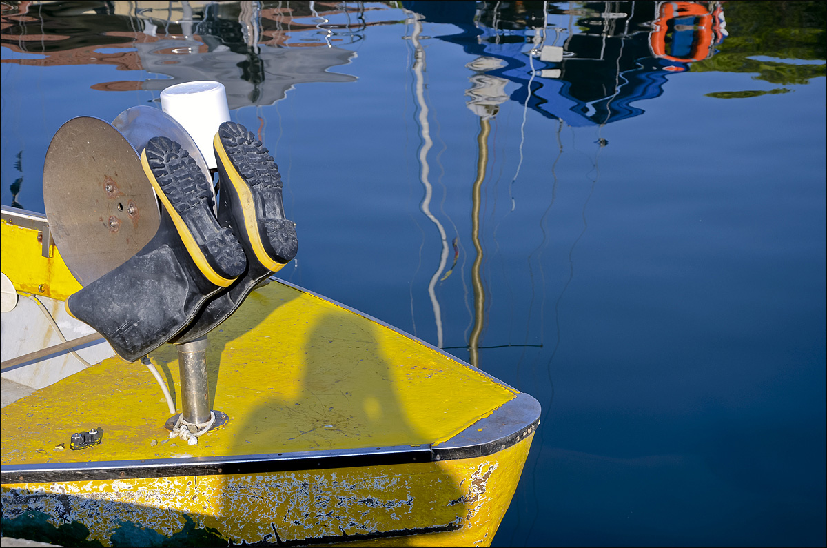 Belli i colori e la prua gialla come la fascia degli stivali, la tua ombra che sottolinea la presenza umana, e i riflessi.