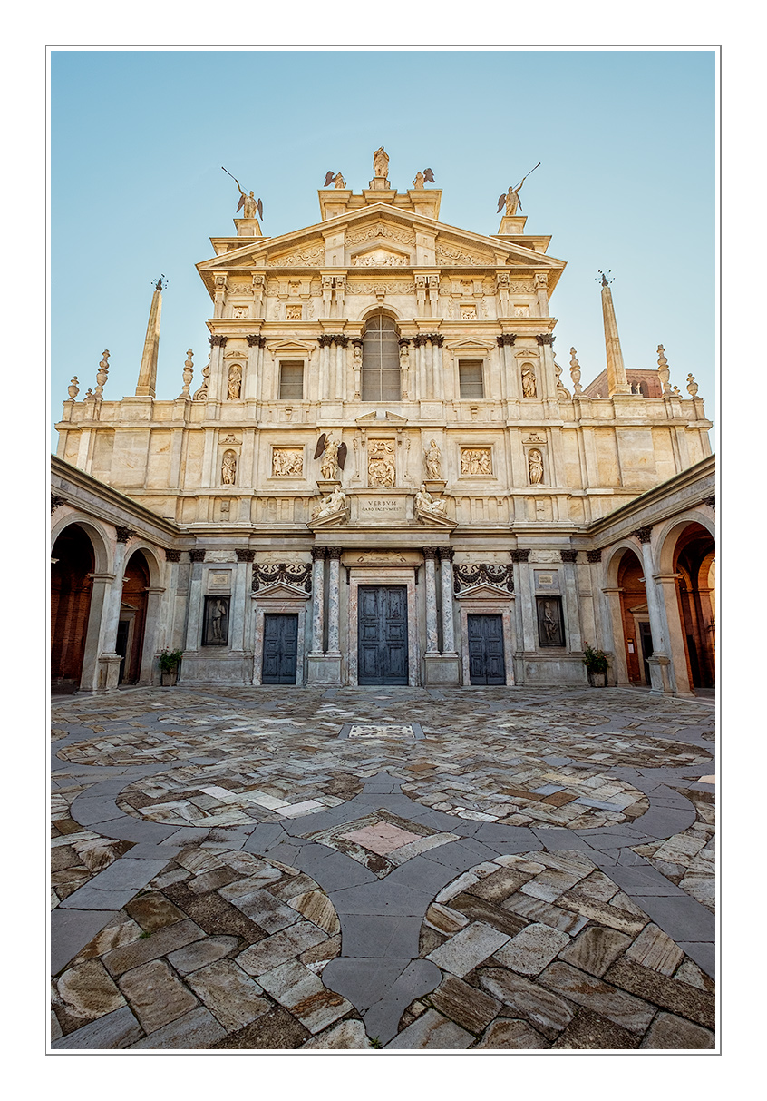 Per le linee cadenti so che è ricercato il rigore delle linee verticali e orizzontali ma volevo anche restituire una prospettiva dell'imponenza della chiesa come la vede un minuscolo e umile fedele al suo cospetto. Infatti ho anche incluso tutto il cortile con annessi ornamenti pavimentati in modo da sentirsene immersi. Mi spiaceva tagliarli via Smile
