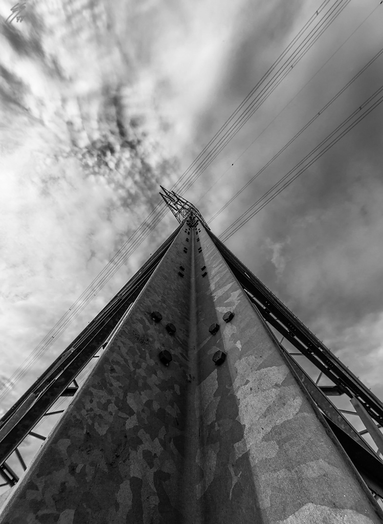 molto bella. Buono il punto di ripresa della struttura che ne esalta lo slancio verso l'alto e l'imponenza- La chicca? i fili formano una diagonale in alto a destra bilanciata da una corrispondente diagonale in alto a sinistra formata dalla striscia di nubi. Questestrisce, insieme con la base della struttura formano e dividono il fotogramma in 4 spicchi quasi corrispondenti per superficie. Il plus? Sarebbe stato un formato quadrato con le basi della struttura corrispondenti agli angoli inferiori del fotogramma.