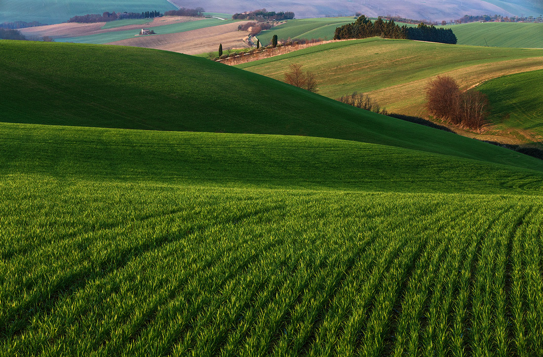 interessante la versione di susanna.. però a me non dispiace nemmeno questa. guardandola l'occhio mi "salta" dal primo colle con le sue belle strisce di grano fino al secondo.. poi al terzo.. poi al quarto dove ci sono gli alberi ... e infine al quinto dove ci sono le case! ....