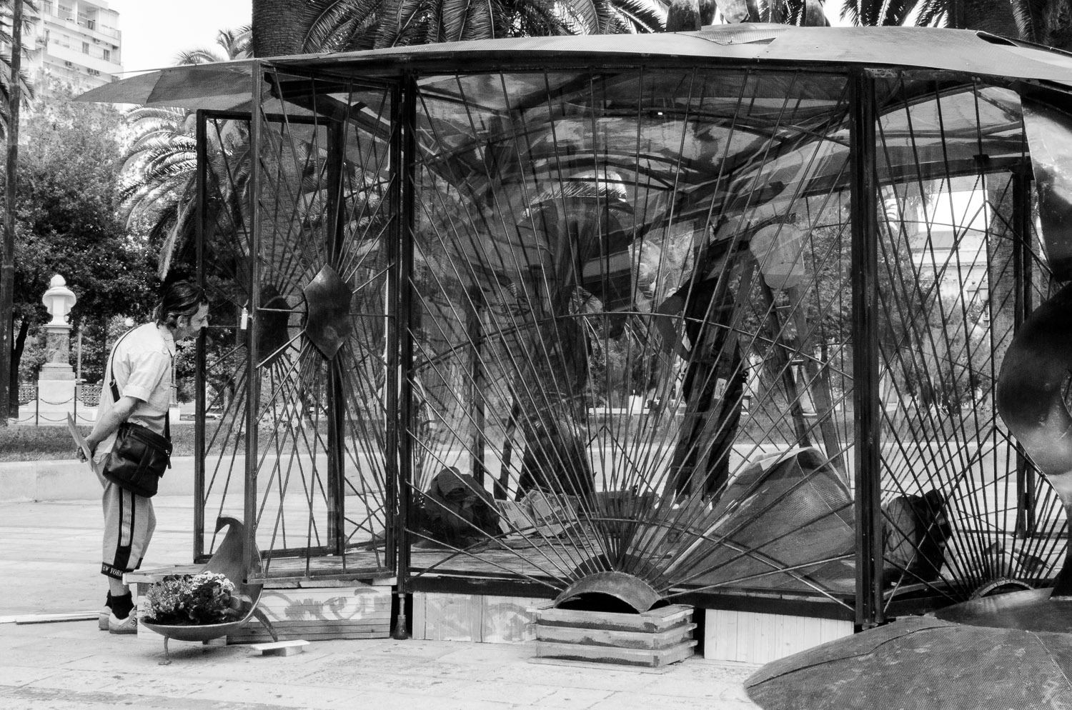 La mia chiave interpretativa era diversa: ho colto l'uomo che guardava, attraverso la porta, l'interno della struttura e lo vedeva chiaramente, mentre dal mio punto di vista, tra riflessi e reti, quello che c'era all'interno della gabbia era davvero poco chiaro.