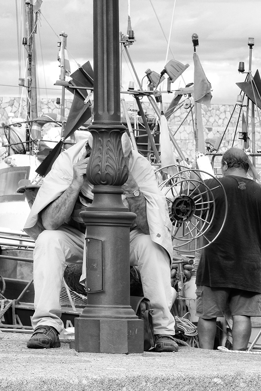 Una improbabile privacy cercata per una telefonata forse importante in un ambiente piuttosto movimentato come il punto di attracco dei pescherecci.Bello il punto di ripresa con il palo che a malapena e pudicamente protegge l'uomo e l'immacabile orecchio "grande fratello" in ascolto.Complimenti anche per l'ottimo bn.Ciao,Sergio.  _________________ Sergio Demitri https://www.flickr.com/photos/124946035@N02/ |
