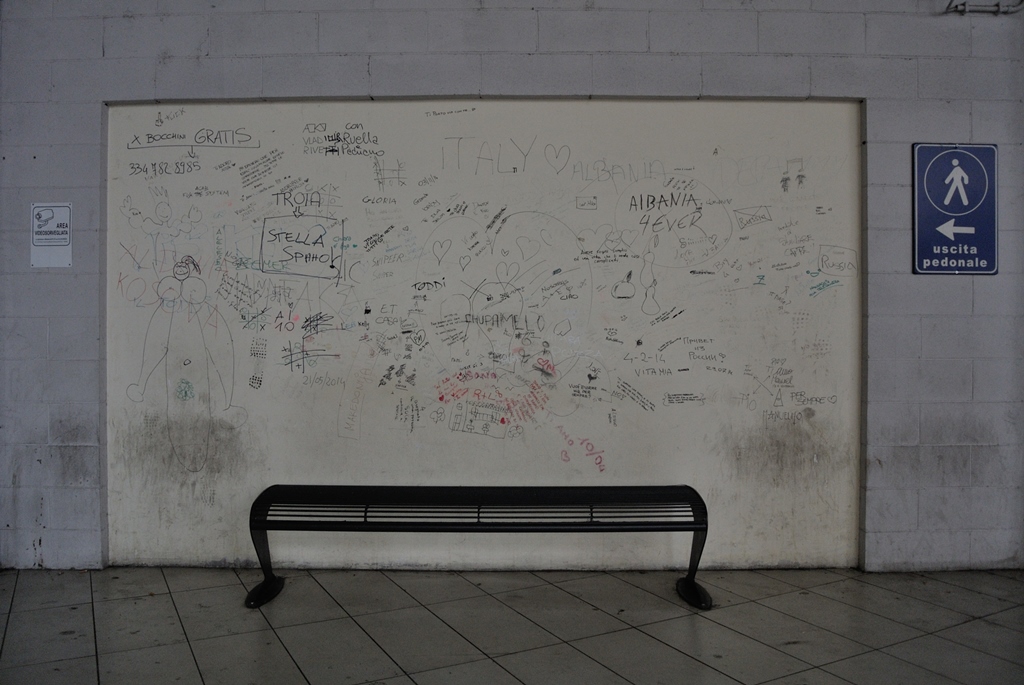 Tutto quello che hai scritto è esattamente quello che ho provato, pensato, che mi ha provocato l'impulso emotivo a soffermarmi di fronte a questa parete e a scattare, nella coscienza che, pur se deserta, su quella panchina continuava ad essere presente l'umanità; una umanità comune, probabilmente fatta in prevalenza di giovani, ma anche di anziani, in attesa di un nulla in mezzo al nulla...