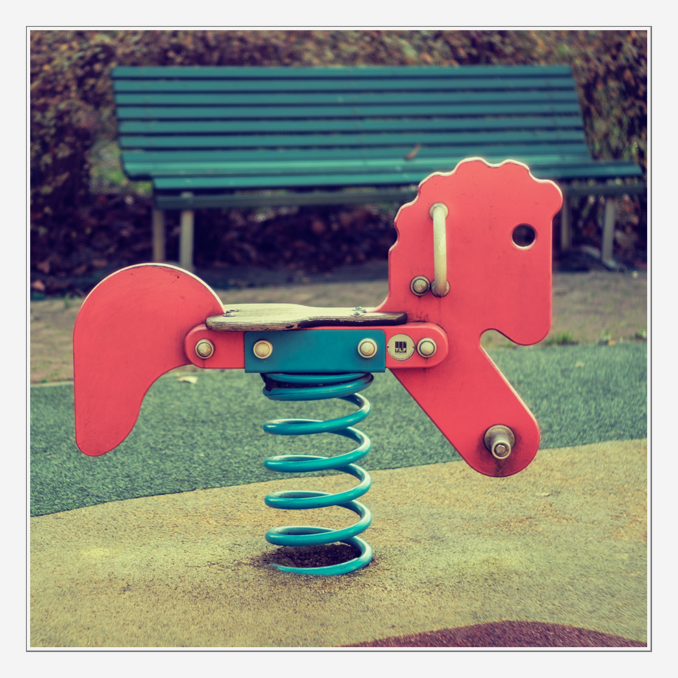 Mi piace molto come il cavallino, fermo, immobile, aspetti qualcuno che da un momento all'altro lo faccia divertire e scalmanare, all'orizzonte pero' non si vede anima viva, questo supportato anche dalla desolata panchina vuota alle sue spalle. La colorazione semi acida che hai donato a questa foto, me la fa piacere ancora di piu'.