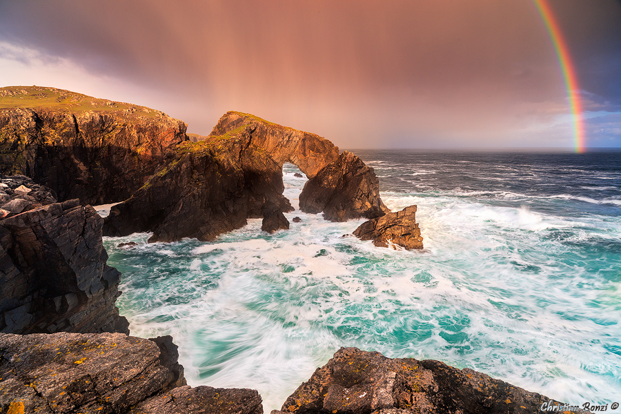 Situazione atmosferica eccezionale con il magnifico arco illuminato dal sole, gli scrosci d'acqua più in là e l'arcobaleno sullo sfondo. Essere al posto giusto al momento giusto è l'essenza della fotografia paesaggistica e non capita frequentemente. Bravo ad essere lì e ad aver realizzato un ottimo scatto