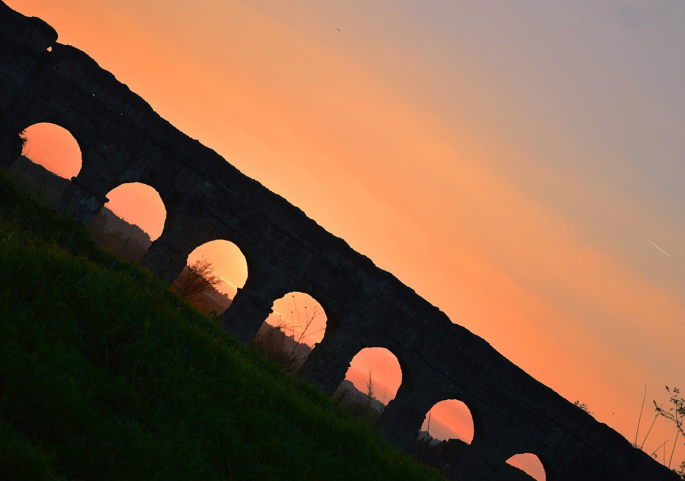 Una inquadratura inusuale che secondo me potrebbe andar bene per una cartolina simpatica da spedire agli amici. I punti forti sono il bel verde del prato, sicuramente l'acquedotto, il bel tramonto con i suoi colori accesi e caldi e la scia dell'aereo; tutto molto affascinante ma ad una condizione se inquadrato correttamente. Ciao