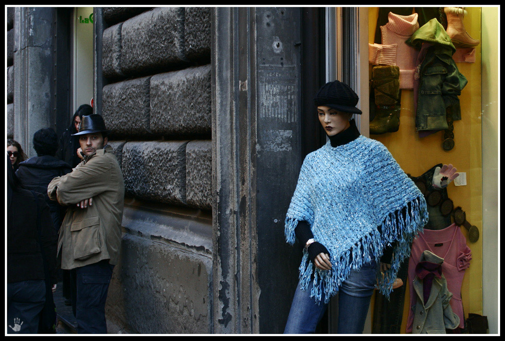 Mi piace l'associazione del ragazzo col cappello, che come un manichino è fermo (immobile?) quasi appoggiato al muro, ed il manichino vero.