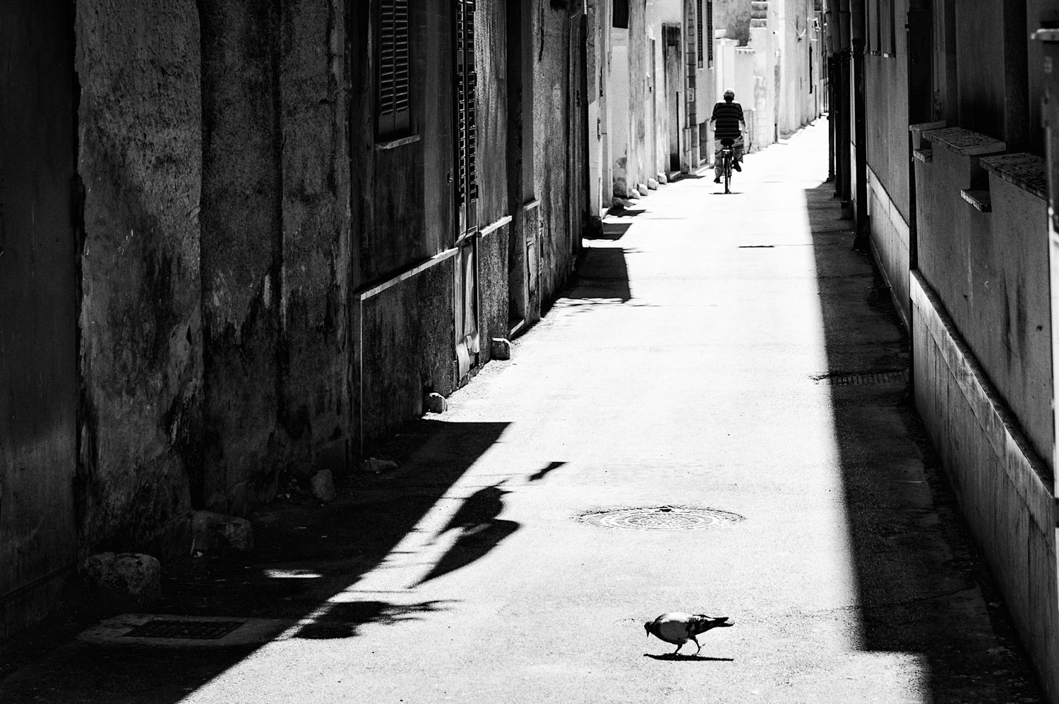 La trovo molto bella, la luce forte crea la sensazione di caldo e quel piccione indolente assieme al ciclista ne aumentano la suggestione.