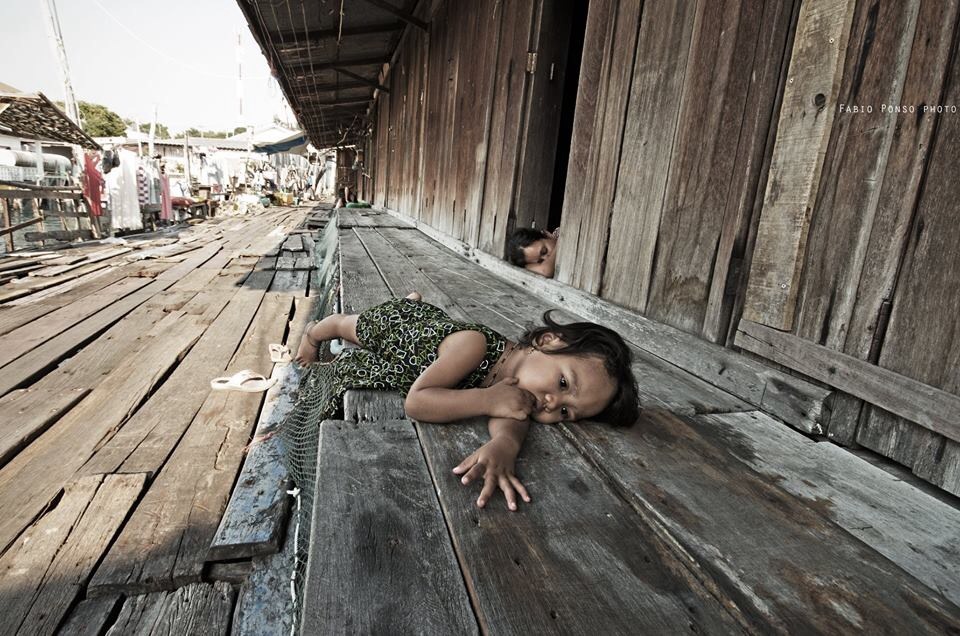 la foto è stata scattata una ventina di giorni fa in un piccolo villaggio di pescatori in Thailandia. La bimba e sua madre invece sono del Myanmar, così come il marito che lavora, così come molti altri suoi connazionali, come pescatore alle dipendenze di qualche signorotto locale per una paga davvero misera (la manodopera dal Myanmar e dalla Cambogia qui è molto ricercata perché costa meno di quella thailandese ed è anche molto affidabile). Vivono in queste palafitte di legno, su un mare straordinario, ma in condizioni piuttosto disagiate... tra l'altro molto spesso da clandestini e cioè senza alcun tipo di permesso di soggiorno... |