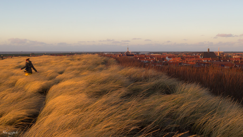 Beh..... stupenda questa camminate nel campo battuto dal vento... e la accoppiata di due tinte forti sotto il cielo neutro è ottima.