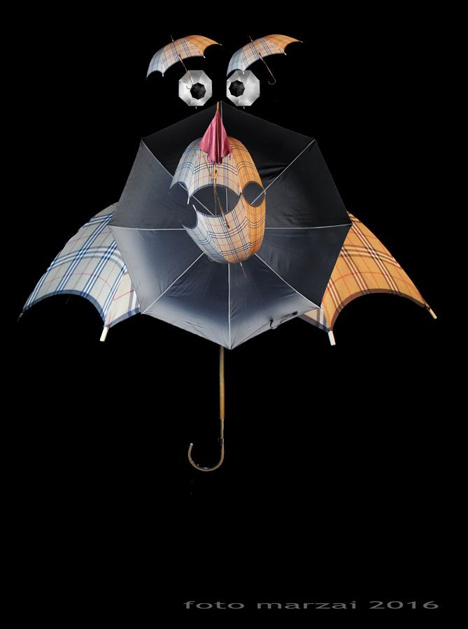 L'assemblaggio dei vari ombrelli oltre a produrre un'espressione surreale, gode di una piacevole tridimensionalità, forse è opinabile la scelta delle luci..quella che dovrebbe essere la mandibola, mostra una luminosità molto forte, ma non lo scrivo come critica, perché a mio avviso la figura ne trae beneficio, però si avverte.