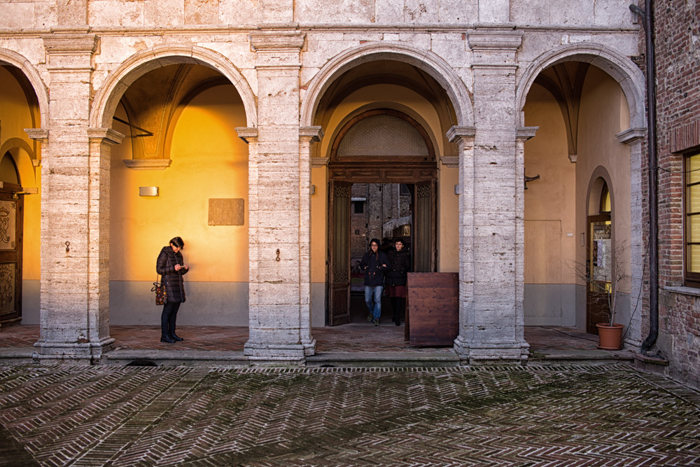 Ho scelto quella che mi piaceva di più e ho scelto di prediligere la posizione della ragazza nell'inquadratura, piuttosto che includere l'ultima campata del portcato. Infondo le persone hanno molta più importanza di una qualsiasi struttura architettonica.