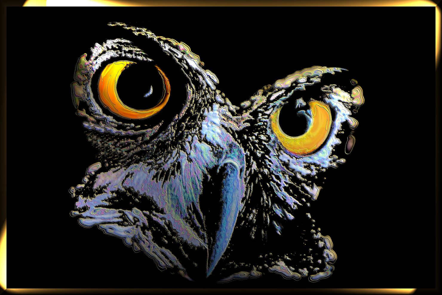 Si la foto di partenza è il viso di un vero gufo ( foto che purtroppo è disturbata dalla rete di una gabbia).Questo sguardo però mi ha sempre attratto è ho quindi pensato di valorizzarlo provando la strada ARTWORK . Ho poi, attraverso il tagli dello sfondo, lavorato sull'immagine con effetti artistici ( questo è smalto) a vari strati con azioni intermedie di fotoritocco, sfumature, contrasti e luci. Se ci sono errori dimmelo ..è messa nei commenti per avere pareri ed indicazioni. Ciao