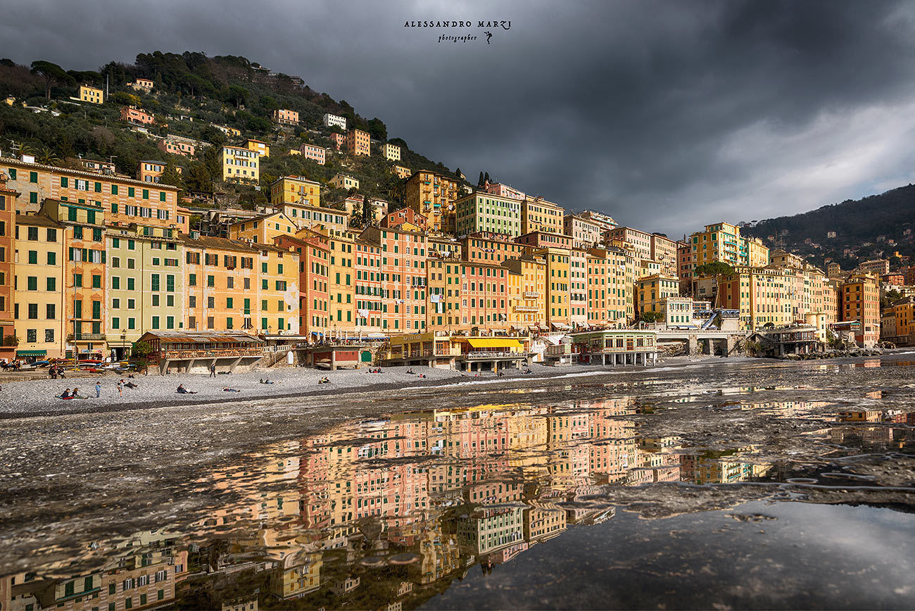 Cesare non era bassa marea. qui ero sul piccolo molo di cemento a camogli. punto di ripresa molto basso per prendere buona parte del riflesso. ogni tanto un'onda alta bagnava il molo.