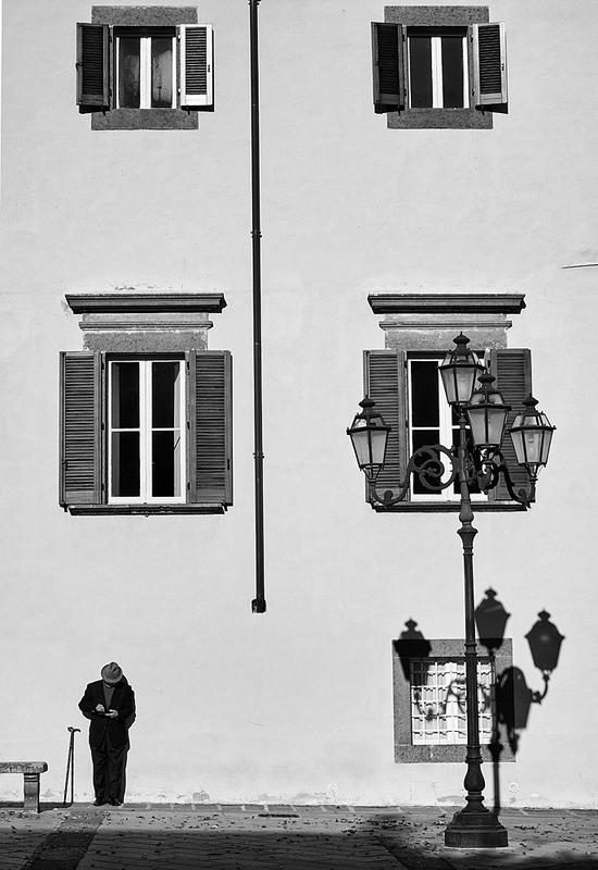 L'omino con il cappello (Bellissimo), è proprio il protagonista della tua foto. Molto bella la composizione, mi piace molto anche l'ombra del lampione, peccato per la sovrapposizione allo stabile, ma probabilmente non potevi fare diversamente.  _________________ Emanuela