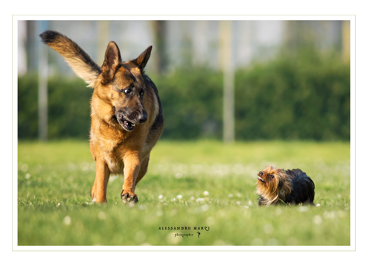 Stupenda! L'attimo colto, le espressioni sono fantastiche. Non potevi fare clic in un momento migliore. Il pastore tedesco ha uno sguardo tra il sorpreso e l'allibito e il cagnetto con una simpatica aggressività. Perfetta la maf e lo stacco sullo sfondo. Complimenti sinceri