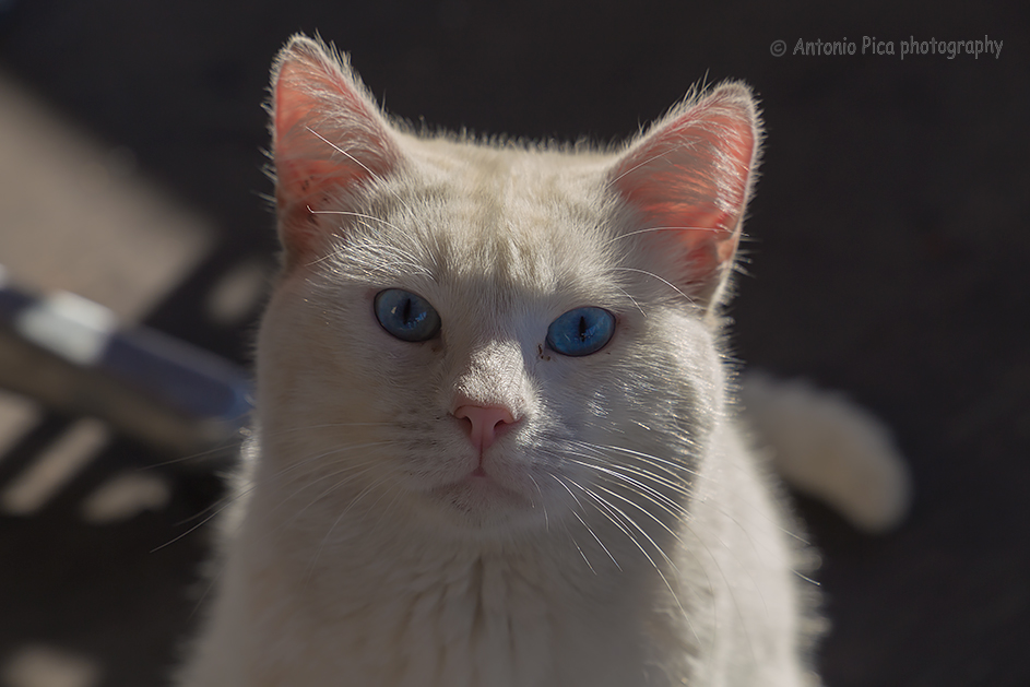 La anteprima non le rende giustizia. Il soggetto è troppo carino, e i due occhi celesti irresistibili in questo sguardo fermo. Peccato a mio parere , più che per la bassa luminosità generale ( non eccessivi contrasto e luce preservano i dettagli del pelo in bianco), per le ombre nette che interferiscono con il musetto. Qui un colpo dosato di flash di riempimento avrebbe forse valorizzato il tutto.