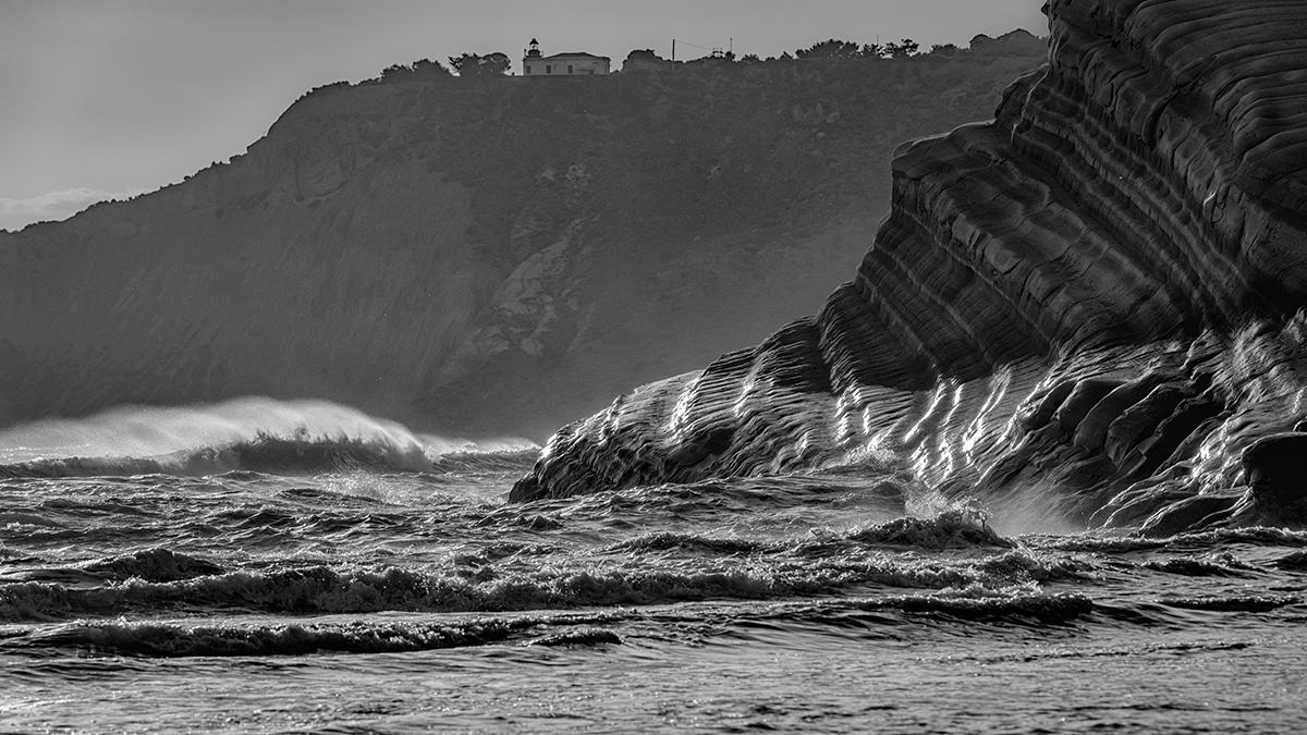 Una luce non facile che credo sia stata una bella sfida domare sia in fase di ripresa che in post (noto un contornino scuro attorno agli elementi sullo sfondo). Mi piacciono invece molto la luce che taglia a metà la roccia a dx e le onde a metà frame