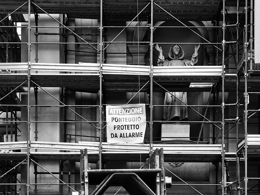 Io avrei optato addirittura per una ripresa che avesse tenuto fuori l'ultima riga del messaggio del cartello: il ponteggio sarebbe stato protetto dalla presenza del santo.