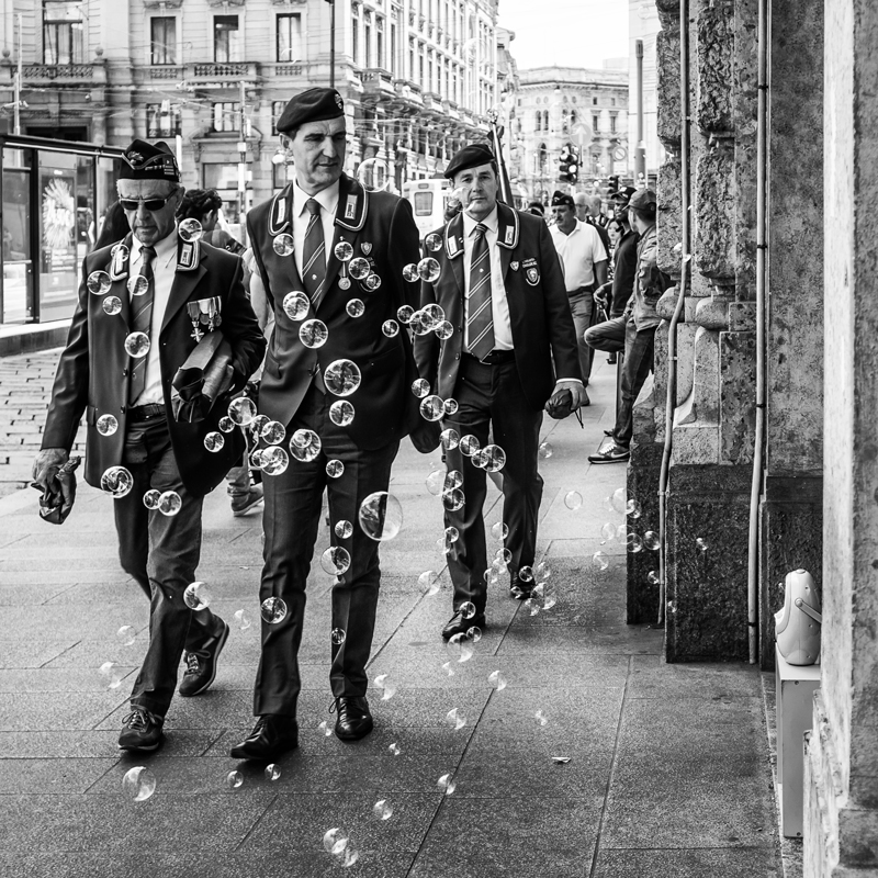 Ottimo il momento colto che contrappone l'atteggiamento fiero di questi militari alla giocosità creata dalle bolle di sapone. Ottima anche la resa del bianco e nero. Bravo  |