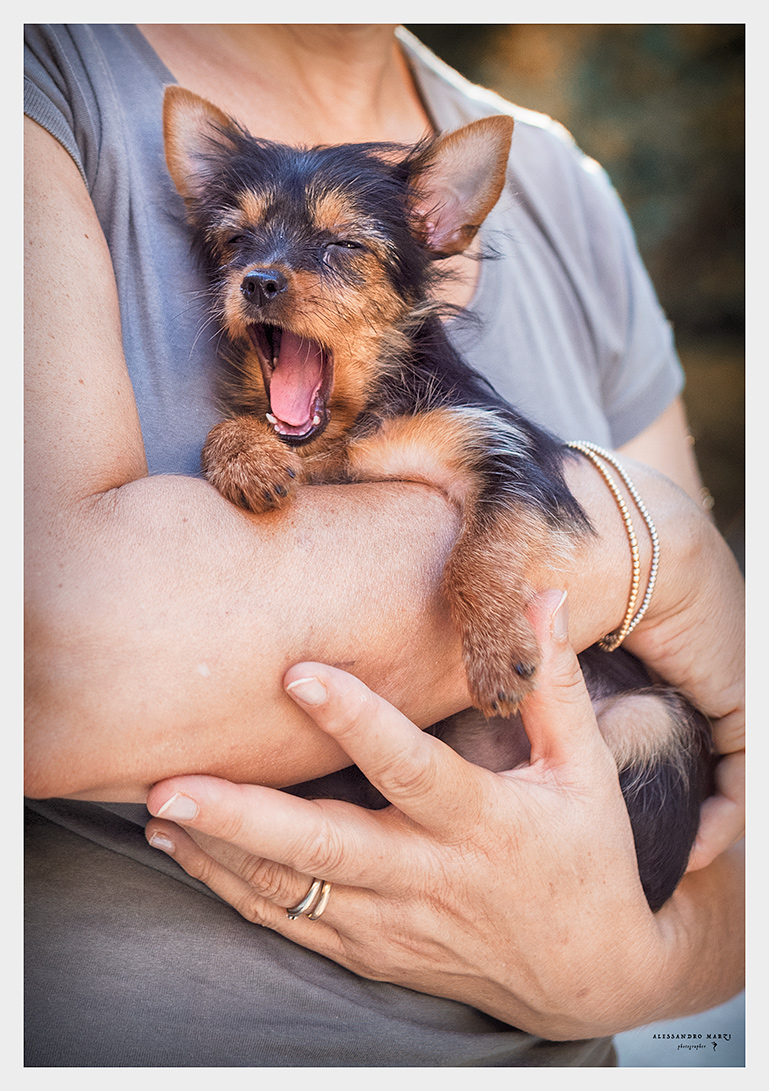 Solitamente non amo molto il flou, ma qui un tocco di morbidezza nella post ci sta benissimo, sembra accompagnare come un soffice sbadiglio fotografico anche l'appisolarsi di Melody dentro l'abbraccio.