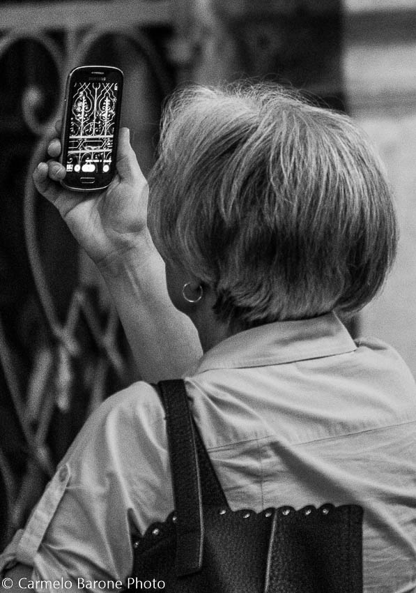 La foto nella foto. L'inferriata ritratta nello smartphone sembra essere un volto, forse da giocare, anche con il titolo, su questa particolarità. Un po grigia nei toni.