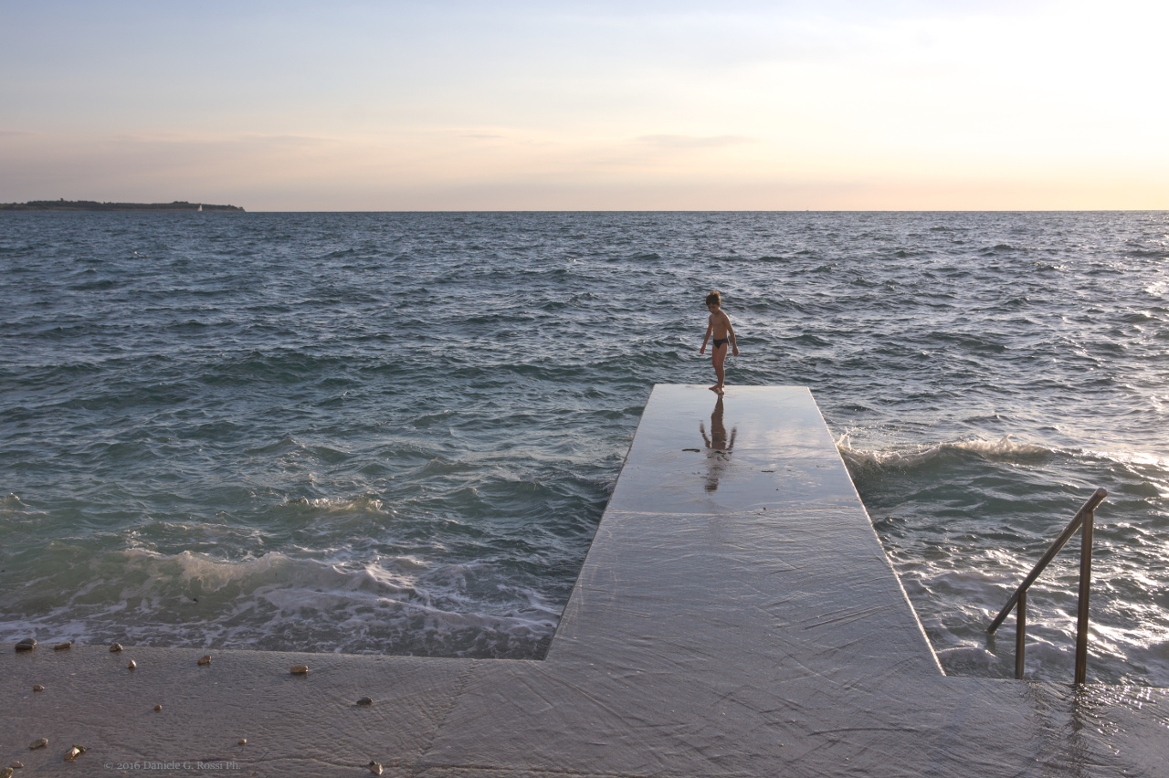 Ciao Daniele, per valorizzare il bambino e il suo riflesso, taglierei tutta la parte orizzontale di cemento e la parte a destra dove c'è il corrimano, lasciando quindi solo il pontile.