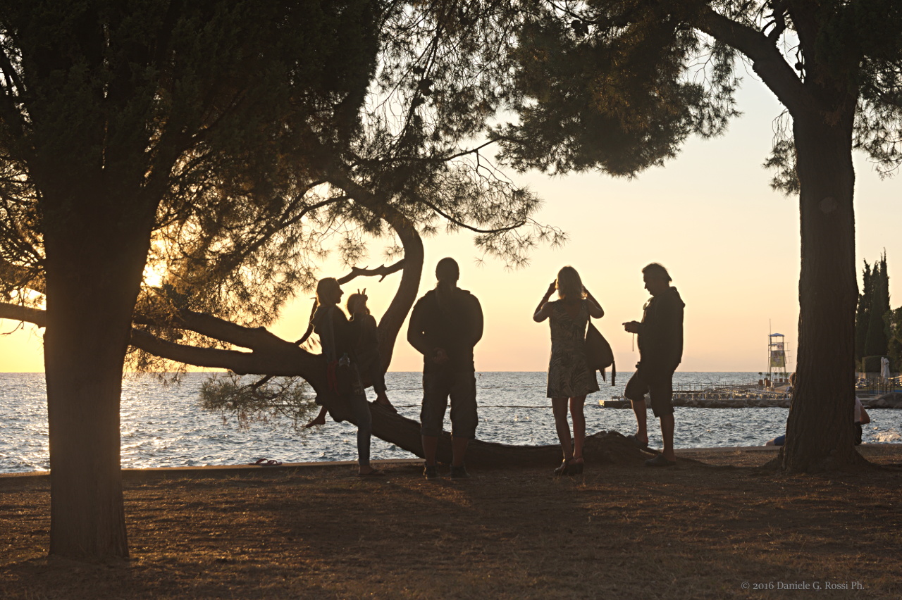Ciao abbastanza complessa nel tipo di silhouette che lascia intravedere i particolari.Immagine dal sapore vacanziero, con il gruppo di persone intento ad immortalare ,il momento piacevole, avvertito come soggetto unico,sul lungomare ombreggiato.Gli alberi formano una sorta di mirino e rimane ancora un po' di respiro,tutto attorno,che ricorda la presenza dell'osservatore attento nel comporre con cura la scena,sfumature del tramonnto gradevoli e credibili.ciao  |