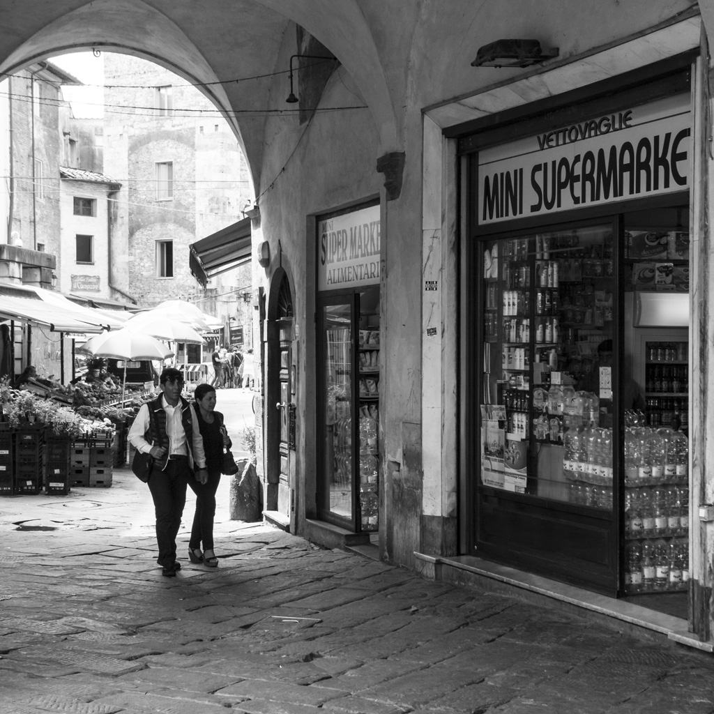 Due supermarkets vicini... ( che se forse è lo stesso esercizio,) ma la vetrina più grande delle due ha la scritta.... mini -supermarket. Un piccolo paradosso, che purtroppo poteva essere base per una street ma qui è valorizzato solo in parte, anche per presenza dei due passanti su cui si concentra la iniziale attenzione.