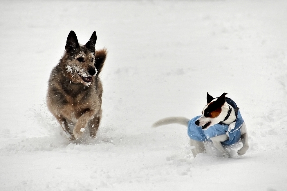 Simpatica questa coppia di cagnolini che si rincorrono e giocano nella neve.