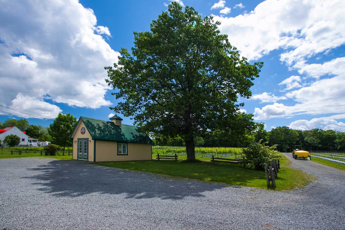 Il grande albero protagonista, giustamente centrale nella scena, con la sua ampia ombre che si proietta a terra e sul tetto della casetta sottostante. Orario e luci nono erano facili da gestire, e infatti forse qualche sforamento dei bianchi fra le nuvole è presente. Anche la distorsione di alcune linee con il grandangolare spinto è presente. Ma nell'insieme la foto è vivida e luminosa.