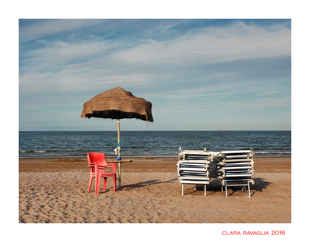 Il giorno e l'estate volgono alla fine,i lettini e le sedie cominciano ad accatastarsi,l'ombrellone ancora aperto attende speranzoso il sole di domani mentre il mare si increspa.Bellissimo scatto ottimamente composto,come sempre magnifici i colori,un pizzico di malinconia. Ciao,Sergio. Smile