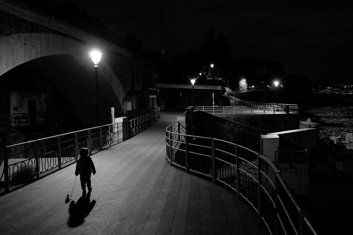 Per il Bianco/Nero la scelta e' stata quella di chiudere i neri soprattutto nella parte riguardante le zone all'interno delle strutture, vedi il ponte alla sinistra, e giu' in fondo, per arrivare alla ns. destra, oltre al cielo notturno, questo per dare quel senso di oscurità, un profondo dark che entra anche nella figura (umana + ombra) del bimbo, rendendolo quasi una silohuette in 3D, mentre i punti luce sono di un bianco accecante e si alternano ai bianchi che troviamo a destra sul parapetto e in fondo nelle luci in lontananza.