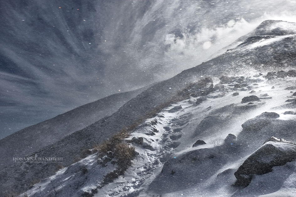Si percepisce il vento grazie alla neve gelida sollevata e tu l'hai immortalata veramente bene, controllando perfettamente bene i bianchi.