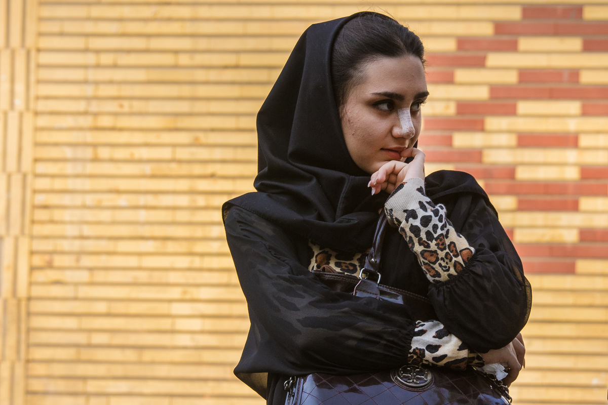 | Tehran, 2016. Vicino al bazar con un nuovo nasino. Si calcola che circa il 20% delle ragazze delle città si ritocchino il naso. |
