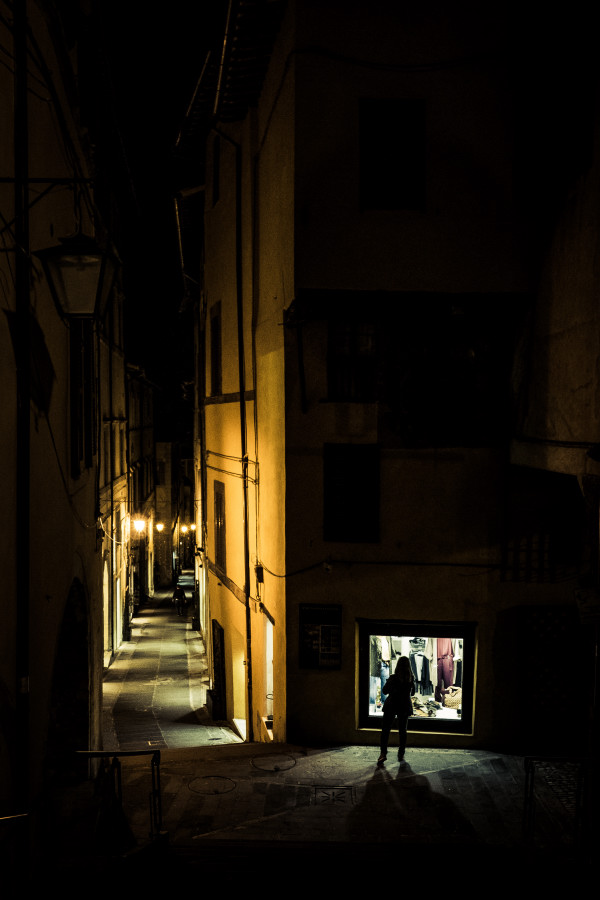 Interessante punto di ripresa per questo bel notturno dove la piccola figura umana è quasi assediata dalle tenebre e sembra trattenersi vicino alla vetrina più per il conforto della luce che per ciò che è esposto.Amo il formato quadrato ma in questo caso preferisco il taglio verticale che accentua la sensazione del buio incombente.Bello anche il colore.  _________________ Sergio Demitri https://www.flickr.com/photos/124946035@N02/ |