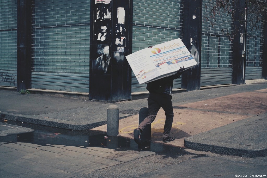 Mi rendo conto di essere affetto da mille pregiudizi, ma la scritta sul cartone e quelle mani scure che appena si intravedono raccontano un mondo, fatto di provvisorietà e lontananza. I manifesti scrostati, la perdita d'acqua e le carte per terra contribuiscono a rendere questa foto commovente.