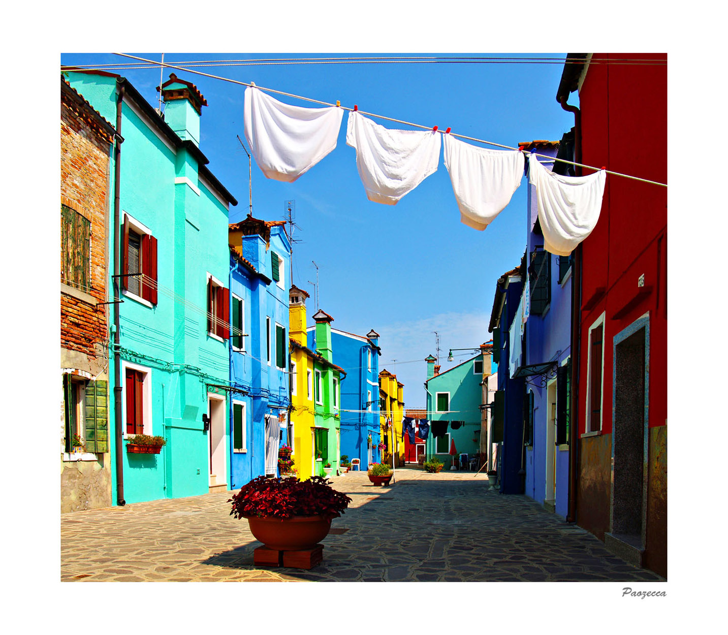 Una famiglia di mutandone protagoniste, a rendere meno classica una rigorosa ripresa coloratissima delle famose vie dalle case multicolori di Burano! Ben pensata in ironica composizione...
