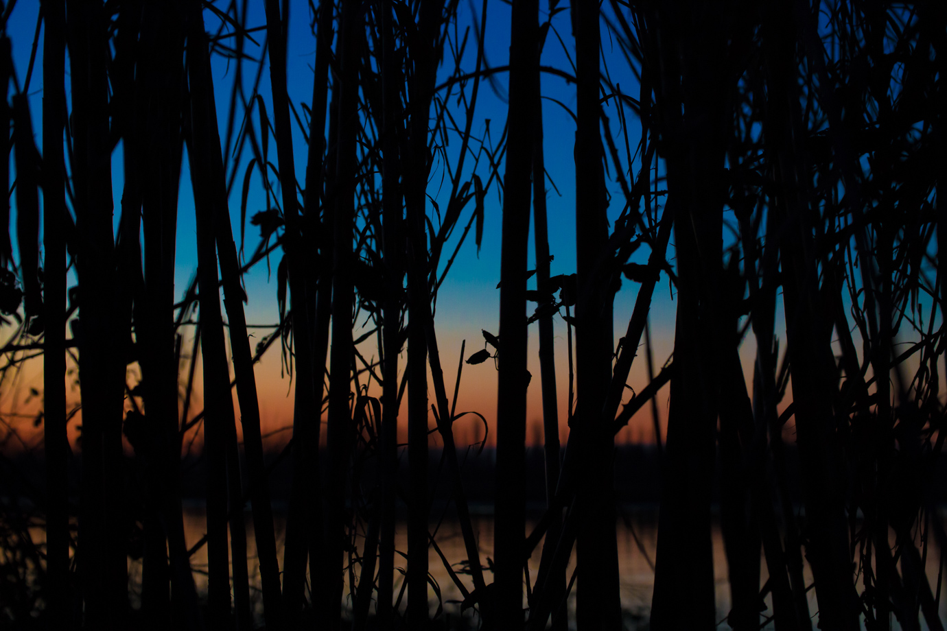 Un crepuscolo imprigionato dal fitto reticolo delle canne che ne limitano la visione. In parte si e' costretti ad immaginare la scena senza limitazioni visive. Un'immagine che puo' celare una sua morale, veicolare un messaggio.