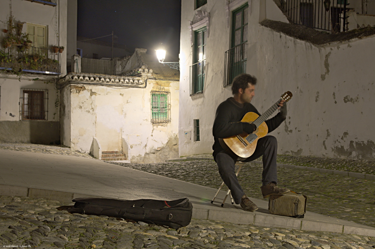 Una fredda sera d'inverno,in uno scorcio di paese desolato,si levano queste note che sembrano più compiacere l'artista di strada che qualche improbabile passante.A meno che non siano una chiave per aprire una di quelle finestre!Bella composizione,ottima gestione della non facile luce,inevitabile e non fastidioso il leggero mosso.Complimenti! Ok! Ciao