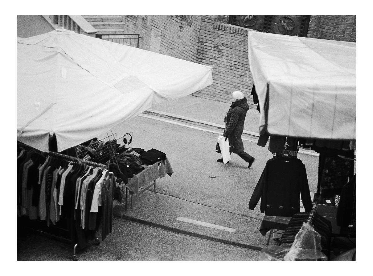 Buono il punto di ripresa e perfetto il momento dello scatto che ha fermato il passaggio della donna tra le due bancarelle.La sensazione è che il freddo sia forte e la gente non abbia tanta voglia di soffermarsi a scegliere.Bello il bn analogico.  _________________ Sergio Demitri https://www.flickr.com/photos/124946035@N02/ |