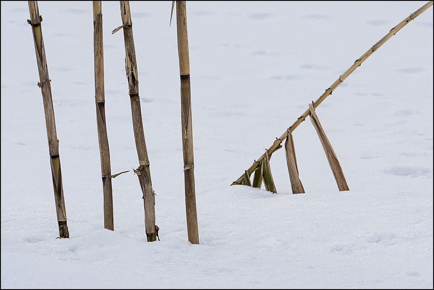 Ciao Renzo,a me principalmente ha colpito la foto per l'inquadratura ben dosata,abbastanza elegante nelle linee direi.Ci sono queste canne,filamenti, in fase invernale,secchi per il clima rigido e l'inverno.Oltretutto la neve tramsette quella sensazione di freddo.I ciuffi sembrano spezzati e sono poche,dal colore sbiadito.Da un diverso punto di vista, si puo' pensare che il soggetto,non sia molto particolare o troppo ricercato ed aspettarsi qualcosa di più accattivante.Non era semplice lo svolgimento,un po' il clima e o l'idea,ad esempio l'accostamento foglie autunno o ancora durante l' inverno,mi sembra abbastanza prevedibile.