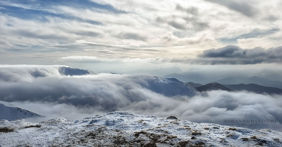 Sembra una normale visione di alta quota, ma qui la composizione è una chiave di lettura per me. Praticamente in ritratto paesaggistico di un l'oltre che è solo cielo, infinito, attraverso un tappeto soffice di nuvole. Neve alla base , che si fa soffice come polvere, mentre nuvole ed azzurro prendono invece sostanza solida , e percorribile, in una bella tentazione di leggerezza . Ecco che compositivamente ha una ragione di essere la precisa successione di piani di roccia e nuvole in basso , quasi paritaria, mentre oltre sta solo il sogno che è diventato conquista.