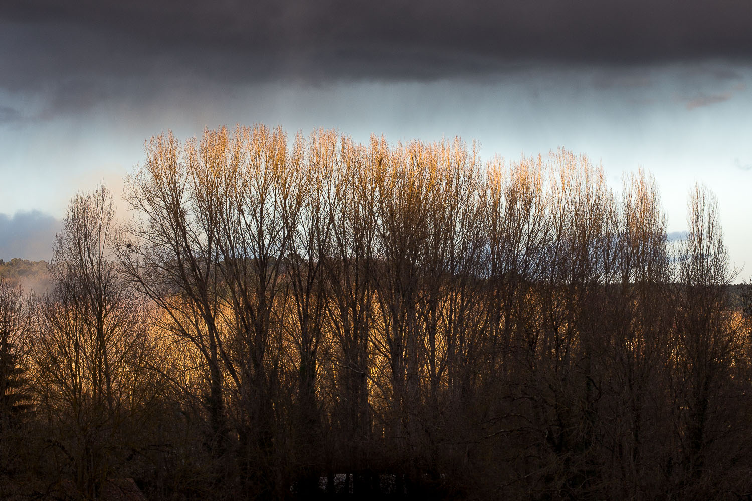 Bella sembra che gli alberi, con le punte, si elevino dall'oscurità per cercare di raggiungere e quindi beneficiare degli ultimi raggi di sole della giornata.